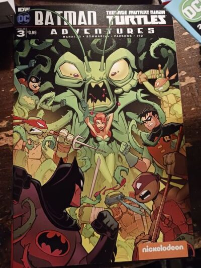 So you like Batman? And you like the Teenage Mutant Ninja Turtles? Well, first, which version of the Turtles? Old school? Then Greener on the Other Side (Batman / Teenage Mutant Ninja Turtles Adventures) will be a little disappointing. If you like the movies or anything contemporary (within the last oh, 10 years or so), Matthew K. Manning and Jon Sommariva’s solo story will be fine. However, I think this might be at least the second book in a series of Batman and TMNT together stories. This story is the four Turtles, Batman, a Robin, and a Batgirl fighting Shredder, his gang, along with the Joker, Harely Quinn and Poison Ivy. There is a monster from the Turtles world that Ivy has attached herself to, and a hint at portals and the two worlds have somehow meshed.