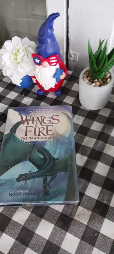 Then there is the third type of series: the series within the series. The Wings of Fire series has several novels, been adapted into graphic novels and has a series within itself. The first five graphic novels follow five different dragons and their story to save their world. When we get to Wings of Fire Graphic Novel #6: Moon Rising by Tui T. Sutherland and Mike Holmes as illustrator, we have completed that arc and start on the next generation of dragons. The themes are the same, growing up, trust, friendship, secrets, and learning from each other and learning to trust yourself, but we have a slightly different arc this time. We now follow a Nightwing (there are at least seven types of dragons), and how she is truly special and possibly dangerous. She represents the new era of dragons.