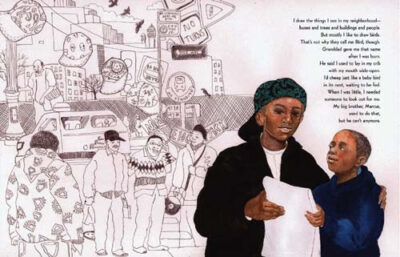 This was one from 2017. This book was at first something that seemed familiar and done over and over. However, I assumed it was more cutting edge at the time. We have a city child (nicknamed Bird by his beloved grandfather), who is dealing with the death of his grandfather. Then we hear the line about Marcus, his big brother, who used to take care of him like granddad did. But he cannot now (we’ll learn why in a few pages). Luckily for Bird he has Uncle Son, a friend of Granddads, when not only the grandfather passed, but Marcus is unable to take care of even himself, let alone do his “big brother duties”.