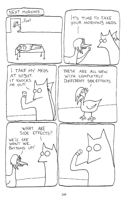 The art is my least favorite part of the book, but fits it perfectly and I don’t see how anything else would work as well. They make things funny with the abstract, child-like artwork that is hiding the down right deadly and sad things happening. A book that isn’t for everyone, but perhaps everyone should read.
