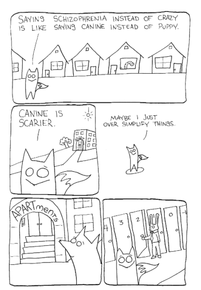 Well Street Noise Books, you did it again with Christi Furnas and their Crazy Like a Fox: Adventures in Schizophrenia. This time, however, I both hated and loved a book from you. This is a surreal satire that is an all too realistic story of how one person (or Fox) goes down the rabbit hole of madness, but really it was just a bit twisted and would eventually start upwards again. Things are crazy (excuse me, we don’t use the crazy word). Things are out there, nuts, looney, coo-coo birdie! Things are the most normal thing in the world.