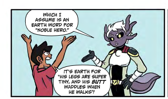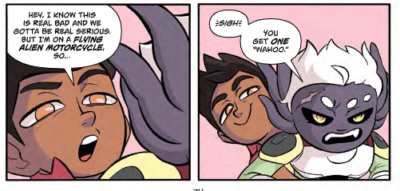 This is not a new idea. The theme is “You are afraid, but it’s okay, and you need to keep fighting.” and “Friends stay together when the chips are down.” The art is cute, clever, colorful and fun, but even that isn’t new. I mean, we know aliens and people and planets and spaceships. We know all of this; seen all of this before. So what makes it a four rating? It is just g-d fun! And there are great puns and jokes and energy. (Corgi: “It’s Earth for “His legs are super tiny, and his BUTT waddles when he walks!”) Things mesh well. It takes a familiar setting/theme/idea and makes it modern while keeping the classic message. The big difference is that our hero is an Earth corgi dog (and it is a dog: likes treats, tries to tinkle on a tree, barks, loves belly rubs) and not some kid or alien being who’s all ripped and muscles. Granted, I was not always a fan of our main human character, but I like how things progressed and the modern elements will grab kids today.