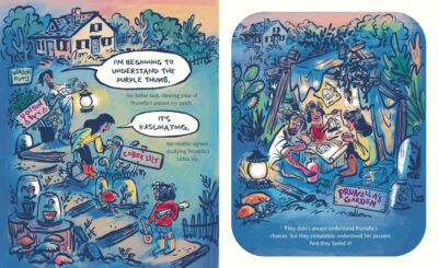 The surface story is the same with both books: girls who love the spookier, odd, weird, dangers, spiky, thorny plants. They like them so much that they are isolated from their communities and peers. In both cases, the parent(s) encourage this individuality, even if they are not completely understanding the ins and outs of it., In Purnella we have the clever addition of a girl born with a purple thumb. Both her parents have green thumbs. But as she grows, nurturing her stingers and stinkers, she also grows more prickly herself. And it is not until another special child enters the picture that things start to change.