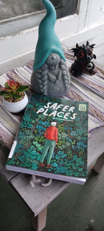 My usual library run was happening (I was picking up a couple of interlibrary loans), when I turned and there was this book, on a display behind me, called Safer Places (by Kit Anderson). At first, it wasn’t anything special, its cover was dark and the rest of the books blended in and it was “too close” to the checkout counter. The second time I went in (more interlibrary) I turned and almost ran into that display (I said it’s close) and I heard the book say, “Get me!” Not one to turn down a plea from a book, I grabbed it, turned and said, “Oh this too!” Checked out, left, and my ride drove off to do other errands. Since books were talking to me, I knew that I was in no shape to interact with people in the grocery store, so I cracked the window, and sat and read in the car.
