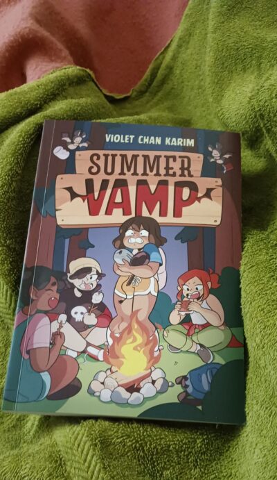 Summer Vamp (A Graphic Novel) by Violet Chan Karim is a fun book. It is not an OMG BEST EVER book, but fun. I enjoyed reading it. As an adult, I am not the intended reader, but I can see where kids will love the vampire angle and the ideas of “coming of age” in a silly and relatable way. And at the same time it is a “grandparent book” or “This is a nice book with nothing really bad happening so the grandparent will like it but the child reader will too.”