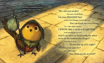 The Knight Owl #2 Knight Owl and Early Bird is the second Knight Owl book by Christopher Denise. (Though you must wait until mid October 2024 for it to be available.) We now have a young early bird who wants to be a Knight Owl as well, but of course, things do not work out as well as they would have liked. After all they are not an owl, and they are terribly bright and chipper and a bit naive. But of course, things will take a turn for the better when day/night the Early Birds unique skill set is exactly what is needed to save the day. And a wonderful, if not unusual and unlikely friendship is created between the Knight Owl and the Early Bird.