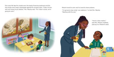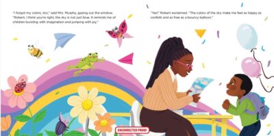 The use of color has been used before as a theme, but to show that there are colors that are in-between the stereotypical ones is fresh. The Sky Is Not Blue is a cute, simple story that allows us to see that not only are we using our imagination, we are using it in real-life situations. It shows the power of art, color and looking at things a little differently (even if that means sitting in the little chair and not the big teacher chair).