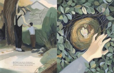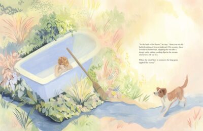The flow of things represents a river, such as the river in the grandfather’s memories. The text not only reflects that but so do the illustrations. They are not just simple illustrations, but art that captures the dreamy, ghost-like atmosphere of things. Yet, everything fits together well. The idea of “ghosts” can be literal or emotional. At first I thought there was the ghost of a grandmother figure, but then there is the ghost of the past and the youth of the grandfather. It is up to the reader to interpret whether things are “real” or imaginary. I really cannot say a lot about things, as it was an emotional reaction I had. I felt the book more than heard it.