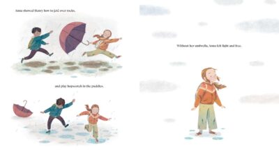And while I enjoyed the overall situation, there were a few bumps in the flow that made things not work for me as strongly as I would have liked. I was not completely sure if Anna’s umbrella was real or a metaphor, but you do see the umbrella and it shows the issues it causes such as you can’t see around it when you sit behind her in the movie theater, she disrupts class with it and her brother thinks it looks ridiculous. Therefore, I am assuming the umbrella is not a metaphor, but she is literally hiding under it. The story starts with rain and ends with rain, so that would make it seem like things can be taken literally, while showing the emotions she is going through.