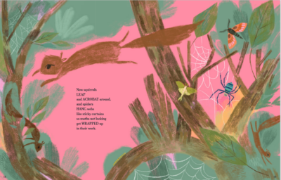 Usually I prefer a non-rhyming format when it comes to reading a picture book, especially or even though it is for a younger audience. However, A Tree Is a Community might have benefited from a rhyme format. Yet, the way it is presented is well done and is executed well. The text is wonderfully expressive and poetic (the leaves are like dresses; seeds grow and WHOOSH!) and I think it would be fun to read aloud (personally I think a one-on-one setting is best, but the group setting is not necessarily not accessible).