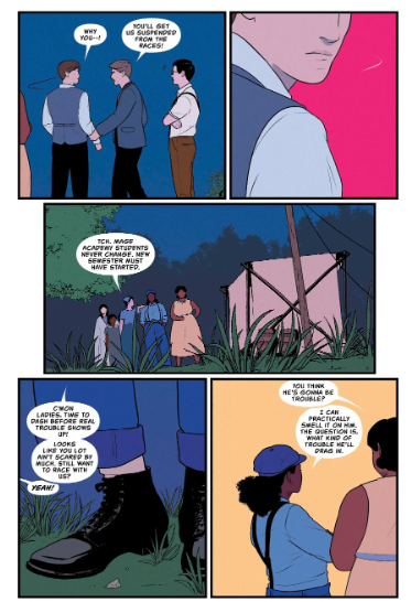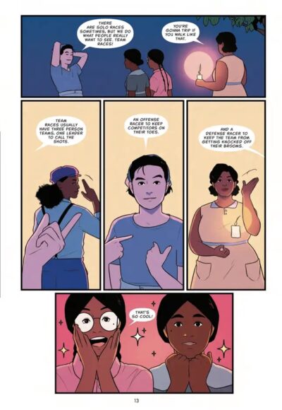 Mostly the art of Duvall shows how the racers/magic users try to survive. Mostly detailing with black individuals (though there is a hierarchy within the people of color), we bring in the natives of the area as well as an Asian family. The worlds intertwine in colorful, simple, but detailed illustrations. This book is a strong read, and while we know the story, the ways things are presented makes it fresh. While the ending is realistic, it does have a few overly idealistic events (SPOILER: we have a trans character that seems to be too quickly accepted by the family due to the times and and other factors), but it is nice to have a basically happy ending for the character.