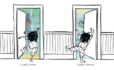 The idea is a young child (I am assuming a young girl) who is moving from the “old home” to the new one. They say goodbye to the important places (the kitchen, the big bedroom, the bathroom and their room). They take stock of “this is the last time I do X, Y, or Z.” But the tone is not said, but hopeful. Then we arrive at the new location and we do things in reverse, saying hello and these are the firsts. And again, with optimism. This change is a good thing. It shows that it might be new, but it is familiar. It might be a cat instead of a horse you pet, but there is writing on the wall, there is a bathroom, kitchen, big bedroom and a room for them along with the new adventures.