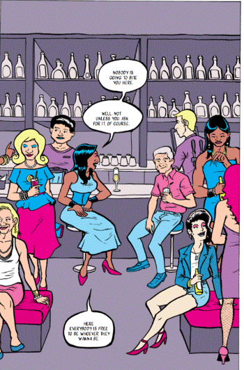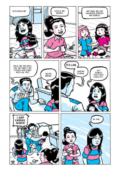 There are a few places that I was uncomfortable with, but I figure that was what the story wanted. It wants you to sit up and pay attention. There also was a plot point I really wish wasn’t happening. I am not sure if this is based on Oliveira’s life, but even if it was a real event, it wasn’t needed. I liked how the use of pink and blue is used to show you what is happening to the characters personalities, presentation and what “should and shouldn’t” be. Then there is the beginning and ending of the story that is in a more full color, more traditional graphic novel/comic format. The details are mostly minimal, and in many cases are “backdrop” and not a character.