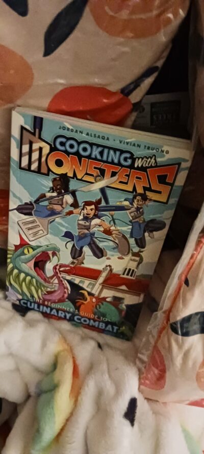 At first, I thought Cooking with Monsters Volume 1 The Beginner’s Guide to Culinary Combat by Jordan Alsaqa and Vivian Truong was going to be a little scary as they are fighting monsters. And it looked older than what it turned out to be, so I was expecting mature death scenes. I thought it was going to be way more serious than it really is. But in the end, the only thing I can say is this graphic novel is: Over. The. Top. The end.