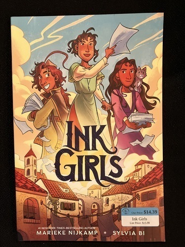 Ink Girls by Marieke Nijkamp and illustrated by Sylvia Bi could be called “one of “those protest books.” And maybe that is the best way to start the review. However, it is more than that. It is about how we see ourselves and others see us. It is about learning to stand up for what is right and not the easy thing. It is about how the youth of a community/city can be a strong voice regardless of being “young.” There is found/finding family (one of the best (and sad) scenes is where Lotta tells us that not all families are able to be happy) and so much more. Yet it is presented for the middle school reader (aged at least 10 to adult, but the 10-15 probably best audience).