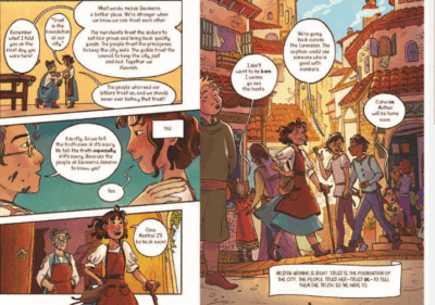 Of course, it is a simple enough story with the newspaper telling the truth, the people that upsets, and the editor/creator being imprisoned because of it. It gets a bit complicated when the author brings in the princess of the community (based on Medieval Italian city-states), her special needs (it sounds not only is she naive, but perhaps a bit autistic) and how the princess and the apprentice to the editor start to see the real city, but it is never over-the-top complex. The extras at the end bring in the historical influences and more.