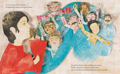 Westergaard’s text and illustrations bring all of this and more alive with poetic text and folk-like art. Things are a little “silly” but also lovely. The combination has a sophistication, lightness and still shows the seriousness of things. The publisher description says the technique is highly dimensional collage work, patterned and embellished with block prints, brush pens, and colored pencil, leans into portraiture and stage scenes in this ode to a beloved figure. It is clever, fun and educational. The result is dreamy, but solid and the extras included are a great addition to the life and times of this performer.