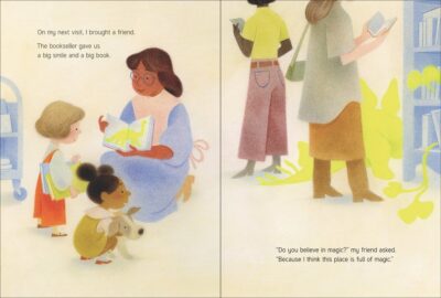 The poetic nature of things starts off like any other book you have read about a bookstore. And if you are not paying attention, you will miss the transformation of when it starts to be a new story. It still sings the praises of books, bookstores and the people (and dogs) there, but we are now moving forward in time. This is where it starts to get a bit heavy. Not heavy in the subject but heavy in the feeling of the text. Still, it is a lovely book and a fun one to tell you how you can get some wonderfully delightful books into your life and your child’s life.