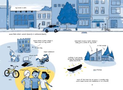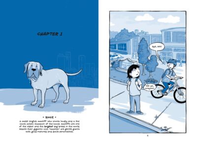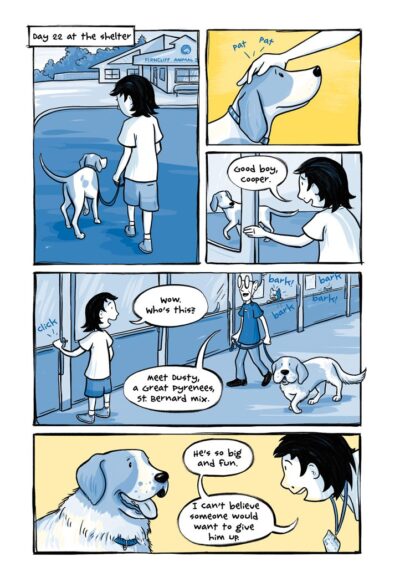 At first things felt like “all the other books” about separated and/or divorced families and the issues that happen. There is a step-mother and younger sister. The dad was going to play “favorites” with his step-daughter/the sister . But once we got to see the dogs and the changes the main character has with understanding his responsibilities and becoming part of this new family, things started to really happen and I found myself enjoying reading. Granted, there were a few bumps, but overall everything was pleasurable. The art is very simple, and as I read via the online reader, I am not sure how they will look finished, but I am assuming things will not change too much, so they are not in color, very minimalistic and quick to read as the text is.