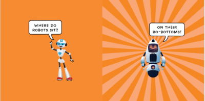 However, How to Make a Robot Laugh: Funny and Easy to Read Jokes for Children Who Love Robotics and Silly Engineering Humor by Chris Cate and How to Make a Shark Laugh also by Chris Cate and Callisto Kids, there are more good than bad (or at least not really really bad). Each one of these books give us silly jokes and puns “For Kids Who Will Tell Future Dad/Uncle or Aunt Jokes.” Everything is simple and big and cute.