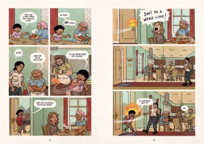 Overall, this is a nice book. Nothing to go WOW over, but enjoyable. The theme itself has been done before, but the modern additions help make it new. The colors and details are typical of a younger graphic novel (bright colors with medium to busy details) so even there we are not getting a “fresh take” but a familiar, cozy atmosphere to things. The settings do not differ much as we just have the school pre-monster attack, and the school post monster attack, with the home of our Not a Hero But the Kid that Showed Up.