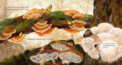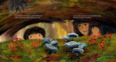 The child and adult, while exploring the forest for mushrooms, experience more than the mushrooms. The child narrator also talks about the things happening underground and other things we might not be able to see. Plus, we find names of different plants and even a few myths along the way. One of the main themes is how the characters normalize the fact that hunting for the mushrooms is natural and you never know what you will find. It is also about how one should not do this solo, but have an educated adult along for the ride.