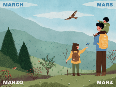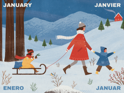 There is a lot to love about the book One Year: Une Année Un Año Ein Jahr. There are adorable illustrations by Julia Leister that give things a bright, fun, and whimsical look. As the publisher’s description says, these “retro-style illustrations” make things cozy and happy. The images tell you the month with the people’s clothing and actions, plus the weather is a great clue. I really enjoyed all of this until the whole point of the book. The four different languages.