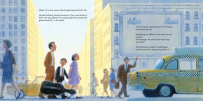We hit the highlights of the life and times of this cellist. There are several facts in the text itself, along with extras as well. This lets the book grow with its readers and allows them to learn as much or as little as they want. But there is nothing little about Yo-Yo Ma. Except for his size when he first started to play. Not only did he not learn something “easy to hold” (like the violin his father and sister played) or to work on his voice like his mother, four-year-old Ma would lug around a cello, considerably smaller than an adult one, but still probably bigger than him.