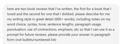 - Finally distilled that down into one long-ish but cohesive block of text that I used as the “style guide” for the book review requests.