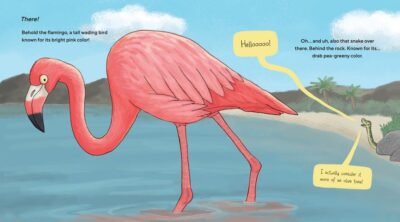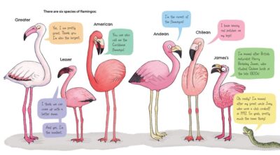 What followed a full on reading, were fantastic facts done in an amazingly humorous way that makes me want to know more about flamingos than I have ever wanted to know before! Did you know they stand in toxic waters? TOXIC! Did you know that they live in large groups, but only connect to a few close buddies? And did you know that there are six main types of flamingos? (It’s true! They are not all lawn ornaments looking. That one is the American or Caribbean one. And yes, they could have found a better name for the Lesser Flamingo).