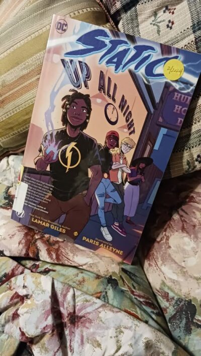 Static Up All Night (volume 1) by Lamar Giles and illustrated by Paris Alleyne is a nice teen superhero story. Our main character, Virgil, is trying to balance a normal life and being a superhero. Set in the DC universe, we have mutant humans (mostly still looking human) that were created by a supposedly safe gas. Afterwards, those who made it were given some sort of powers (one girl hasn’t slept literally since it happened, so she has time to study, do multiple jobs, and observe; our hero can control electricity). So we have seen this story before. It is Spiderman in DC. The fun part is, our heroes are people of color, given it a wonderful diversity in its cast.