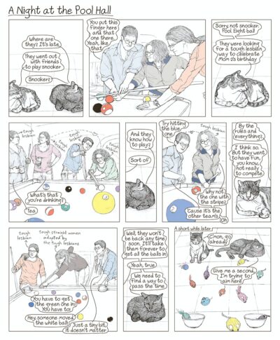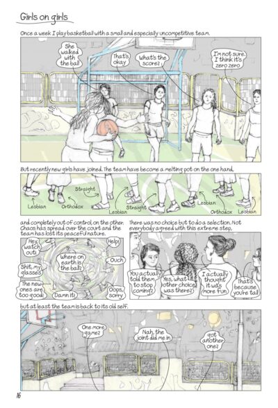 Everyday events and not so everyday events, are woven together to make an interesting look at life as a Lesbian-Cat-Mom-Cartoonist in Israel. Seeing the ups and downs of money woes, the “needing a man” moments, owning multiple cats, trying to find jobs, fight the good fight with politics, and saving your home from an army of ants come alive in one or two page comics that actually temper the seriousness of things with some dry (and not so dry) humor. The style of the illustrations sets the tone of things. Not only is it relatable as an adult reader trying to make ends meet, it is also a nice introduction to the politics of the time and nation. However, if you do not like talking cat moments, you might not like it, but I felt it actually enhances the points.