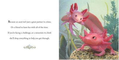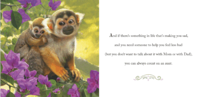 It is not my usual “go to” type of book due to the pastel colors, whimsy to the illustrations and that overly young feeling. However, it would work well for someone with a more traditional outlook and not just from the aunt, but also for and/or from the Grand Aunt in the child’s life. (Though I am writing my Grand Aunt book for my grand niece because I’m a one of a kind aunt and grand aunt!)