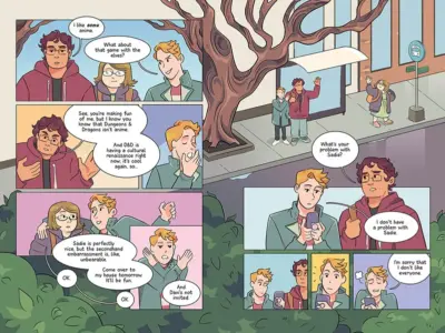 The graphic novel’s plot follows Evan Horowitz, a high school student who is head of his school’s Gender and Sexualities Alliance Club (GSA), a ballet dancer, an Instagram influencer, and thinks they are the best at matchmaking. The text shows us that Evan was successful at least once in the past, as he got his sister and the boy next door together, and then they got married. And now they have a cute daughter! This has tied the two families together, and Evan has remained friends with his brother-in-law’s younger brother, Davi. Evan takes a new transfer student (Natalia) under his wing and tries to … help her. He identifies her early on as someone deserving of pity, and then help, and decides to take her on as a project of sorts because he fears the school will eat her alive.