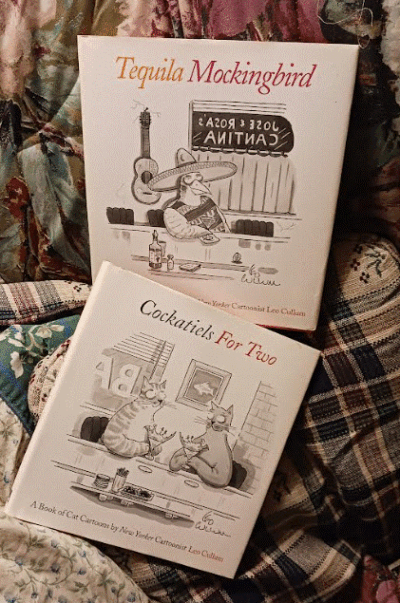 A few weeks ago one of my cousins texted me to inform me that she left some books at her mothers place she thought I might like. I thanked her but then forgot about it. A few days later, there were a few books on the table (my dad had stopped by her place and was elected the delivery boy). They were these larger, square, white covered books called Cockatiels for Two: A Book of Cat Cartoons by Leo Cullum and Tequila Mockingbird: A Book of Animal Cartoons also by Cullum.