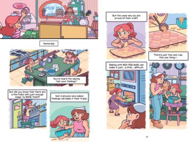 Of course, the story will go on to describe what happens when a bad feeling is baked into food, then eaten by others. This bad feeling comes from the fact the aunt of our main gal is killed in an accident (while it could be a trigger, for the most part it is handled tastefully. Though to show that an accident happened, the damaged car is shown) and she bakes when upset. There is also a side story with a nonbinary character therefore capturing a familiar story (the death of a mother figure/loved one) and more modern elements. The best friend is an interesting character, and really is a great tool for showing how friends are there for each other even when one is being less than friendly.