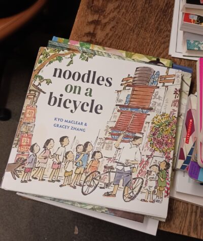 I can be a snob when a book is given high praise. Especially winning something like the Caldecott or even a Caldecott honor award. Now, that is not to say the book wasn’t deserving, but I have the personality that says, “Was it really that good?” Usually, I can enjoy it, but no, it was not worth the “hype.” I said usually. The picture book Noodle on a Bicycle (Caldecott Honor Book) by Kyo Maclear and Gracey Zhang (as the illustrator) was worth the award(s) and the hype. I enjoyed it a lot, even having a small gasp over a couple of facts.