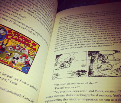 The book begins – as I expected – with a mystery. An Italian bookseller named Yambo awakens in the hospital having lost most of his memory. He remembers everything he’s ever read but not a thing about himself, and the book follows him as he tries to rediscover who he is. Yambo returns to his childhood home and attempts to discover himself through the books he read as a child, and the book includes some truly beautiful and fun cover art and comics from the era. Yambo bounces between reading current events to the children’s books and school essays he wrote during those years, and it’s fascinating to follow World War II via newspaper updates, music, art, and children’s comic books.