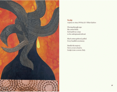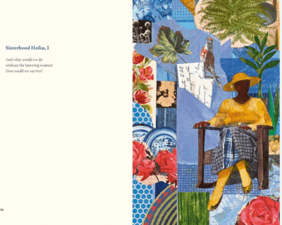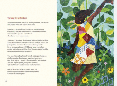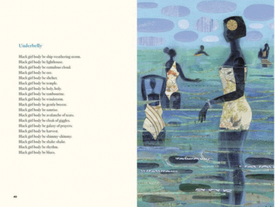 Now, if you are not a fan of the words (that’s sad, but I can appreciate that it does not always work out), I hope you can be amazed by the fantastically gorgeous illustrations, nah artwork, of Ekua Holmes. The rich, deep colors pop off the pages, yet are soft and smooth. Mixed media must have been used as occasionally a newspaper looking piece of paper will show the words leaking through. They have a classical and modern look to them. Silhouettes of people and places are detailed but also almost abstract. They are their own story while supporting the poetry Watson gives us.