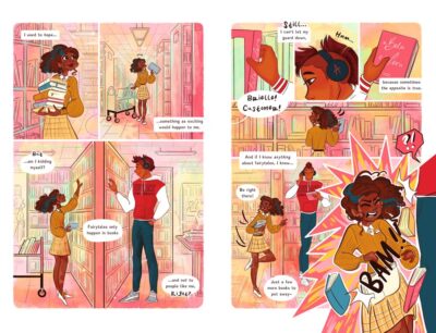 Maybe Brielle and Bear: Volume 1: (A Graphic Novel) (Once Upon a Time University) is not a pure 4, but it is a silly, fun, “meet cute” romance that has a bit of potential to be a smidgen darker and that potential gives it a slight boost over. Based on Beauty and the Beast (Brielle=Belle; Bear=Beast), this fairy tale follows the (so far) 10 rules of fairy tales. All the elements of falling in love, learning about each other and more are wrapped up in a pretty in pink bow that occasionally comes undone to give a little tense flavor to things.