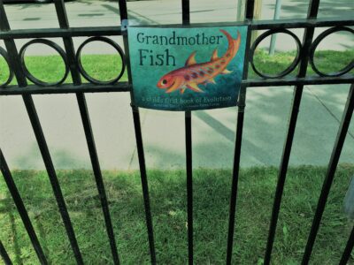 One Monday morning I get into work smidgen later than usual, so my whole system is just off. During a moment of situating myself, I see that there are some books on the cart for the children’s floor. On top of a pile was a book of a red colored fish. It said “Grandmother Fish” and I thought, “Well it could be a cute story.” However, I only saw the first part and not the whole title: Grandmother Fish: A Child’s First Book of Evolution by Jonathan Tweet and Karen Lewis as the illustrator.