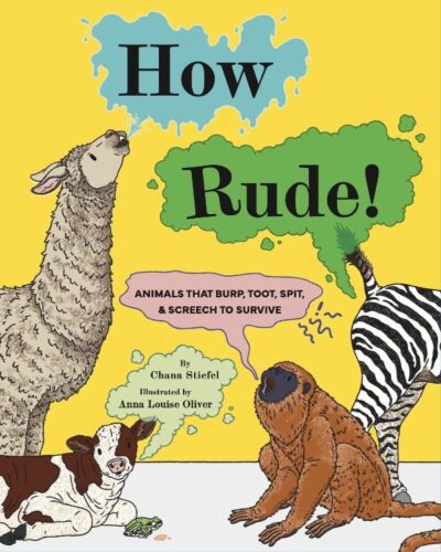 What book am I talking about? How Rude!: Animals That Burp, Toot, Spit, and Screech to Survive by Chana Stiefel and Anna Louise Oliver as the illustrator. We follow slimers with burpers and farters. Birds don’t fart, but zebras do (especially when startled). Cows and similar creatures produce so much methane it is helping to cause climate change.