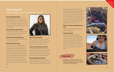 We then follow up with… okay I’ll stop there. I don’t want to ruin the fun for you. And not only are you going to have fun learning how the animal kingdom seems rude(but really isn’t) we meet a few people (or scientists) that have fun with these creatures, too. After the chapter we have an interview with a scientist who talks about slime (like how snails and cosmetics come together) or poop, snakes, herpetology and so much more. There are all types of scientific facts (some I knew and new ones). Plus, not only are there scientific facts about each animal, there are sidebars with more farts… I mean facts.