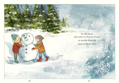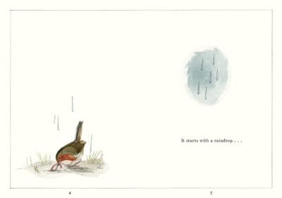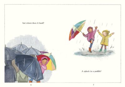 I almost did not write a review for It Starts With A Raindrop by Sally Garland and illustrated by Aimee Gallagher. This was not because it was bad, or because I didn’t like it, but because it started as a “been there done that” read. It is a poem (slightly romantic and feeling simplistic) about the life cycle of a raindrop and the things it does. You have facts about things (the drop will fall in the puddles, or sand; it will find oceans and give drinks to animals; it will even start all over again when the clouds are full and ready to drop their drops), but it is all done as one longer poem. Each line is fine on its own, but they do need each other linked together.