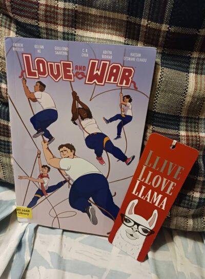 Once upon a time, I was on the Evil Empire site and it said that I could “buy” a copy of Love and War by Andrew Wheeler, Killian Ng (illustrator), and the rest of the gang (it takes a wonderful village to make a graphic novel) as an e-book. However, I hope I didn’t use actual money or even real points from my credit card as I don’t buy e-books (long story). Especially since when I was cleaning up that account (that I really shouldn’t have to start with and another long story) it had already been “removed” and fairly quickly at that. But I was okay with that, as I didn’t want to read it now (another long story), but eventually I decided I did want to read it after all, and found it via an interlibrary loan.