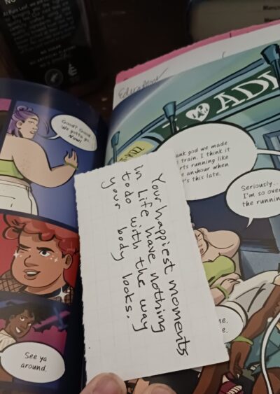 What was totally unexpected for me was, when I was killing a few minutes and reading a few pages toward the beginning of the end of the graphic novel, something slipped out. It was larger than a business card piece of paper. It had a saying on it that I am not sure really fit the book, but it was placed on a page that would fit if you were not really sure of the context of the page or book. But I also thought that maybe someone lost their bookmark, or the paper they wrote a saying down on/someone wrote down for them. I hope it was not too important, but (like most things I find in a book) I left it for the next reader. I don’t know, maybe they will need something just like that.