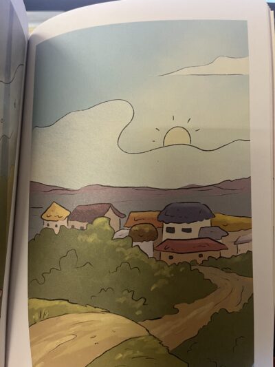 The art is beautiful. The cover is quite vivid, but the panels within the book lean toward a pastel palette.