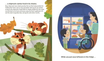 The human eats a variety of foods, but the panda only eats one. The human eats one meal at a time, but there is a mouse that eats about every fifteen minutes or so. Humans chew their food but a snake swallows it whole. A crocodile eats rocks not for tasty but to help digestion where as humans, well a few kids I knew ate them, too, but they weren’t supposed to. This is done in a “side by side” comparison format. Reed’s illustrations will show an animal doing the act, while the somewhat equivalent by the human is shown on the page previous. They give you the introduction without going into too much detail, but are not overly lacking either.