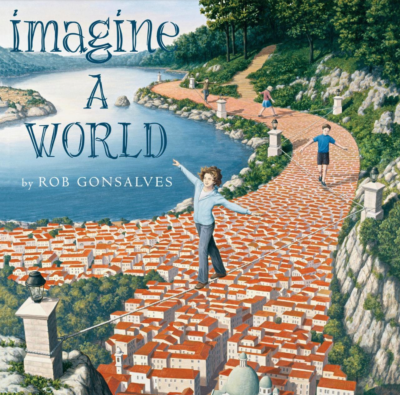 This is another super lazy one for me, but this time because the book is primarily a picture book. Rob Gonsalves came into my awareness through a BlueSky post, I think. He draws beautiful pictures where the scene transitions throughout the picture. I’m including my favorite work from the book below as an example. It’s my favorite because the stanza on this page talks about how small steps can lead us to great things, and you can see that in earnest with a picture like this, showing kids learning to slack line slowly, and eventually working up to towering over an entire city on their tight rope. This is a beautiful book, both in terms of inspiring words and in terms of fascinating, enriching pictures. I recommend it to everyone, especially anyone with young kids who need that bedtime reading.