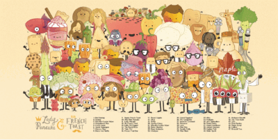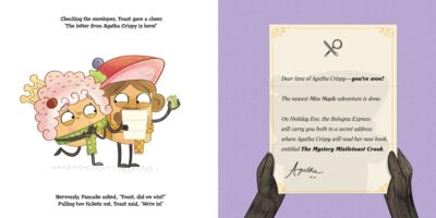 I love the “Murder Mystery Game” aspect (Clue would be proud) but instead of a murder (it is a children’s book after all) we have a missing book written by Agatha Crispy. I would say that two readings would be a good idea (one to read the story and the other to see the clues). As we follow the suspects looking for those clues, the story quickly moves along, rhyming along the way. We follow the food-characters and can snicker at the puns and silly representations of the suspects, such as Brie (who is cheese and grapes). Of course, our heroes Lady Pancake and Sir French Toast will save the day and a neat thank you comes about as their reward.